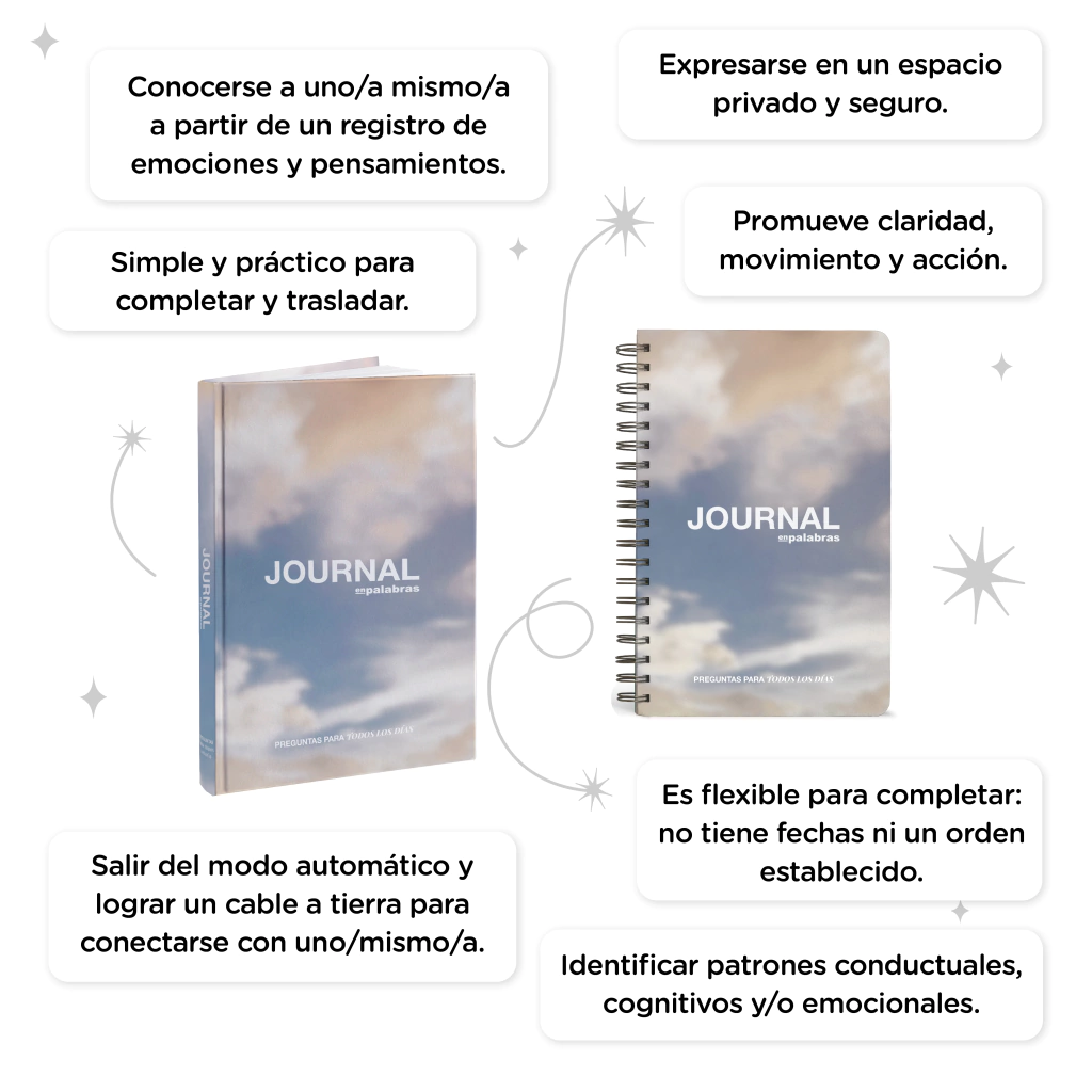 El Journal de En Palabras es una invitación a registrar nuestras emociones y pensamientos a diario, descubrir patrones, superar limitaciones y encontrar oportunidades para el crecimiento personal, ofreciéndonos la oportunidad de conocernos mejor.